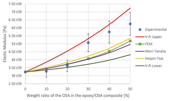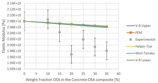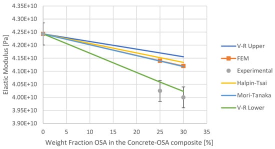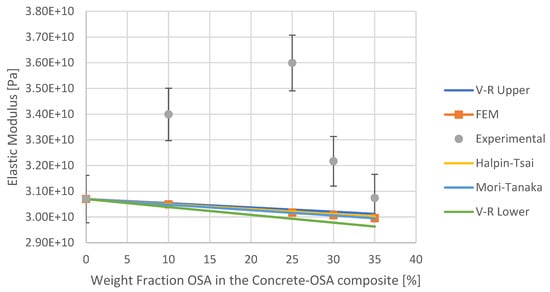 The experimental results were compared with the analytical results. In the case of the composite epoxy-resin–OSA material, methods such as the rule of mixtures, Halpin–Tsai rule, Mori–Tanaka method, and finite element method (FEM) were used. In the case of the concrete–OSA composite, the experimental data were compared with the predictions from the rule of mixtures [].