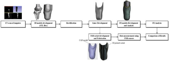 Figure 1 depicts the flow chart illustrating the methodology employed for the development of CAD model, FE model, and the manufacturing process of a TSB prosthetic socket. The subsequent sections provide a comprehensive discussion of each step in the methodology.