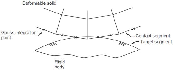 To simplify the model, bones and soft tissues were represented as a single body with distinct material properties, as detailed in Table 1. A surface-to-surface contact pair, using TARGE 170 and CONTA 174 elements with a coefficient of friction (COF) of 0.6, was defined to simulate the interaction between the stump and liner [,]. The inner surfaces of the liner and the stump were designated as the target and contact bodies, respectively. This configuration followed ANSYS’s surface-to-surface contact formulation, which stipulates that the stiffer material is assigned as the target body []. This configuration followed ANSYS’s surface-to-surface contact formulation, which stipulates that the stiffer material is assigned as the target body, as shown in Figure 2.