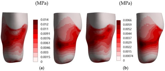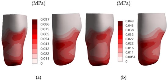 Figure 6 illustrates the resultant shear stress distribution at the stump–liner interface. The resultant shear stress combines the circumferential and longitudinal shear stress components at the contact interface. The highest shear stress under both loading conditions was observed in the lateral region near the fibula head. The patellar tendon region (anterior side) and the stump end exhibited shear stress values of 8 kPa and 7 kPa, respectively.