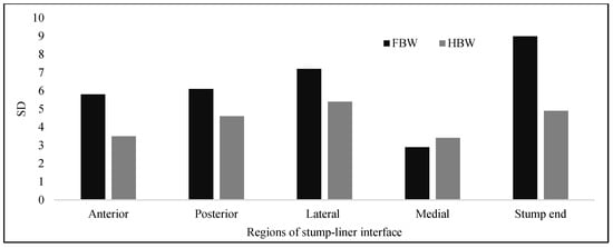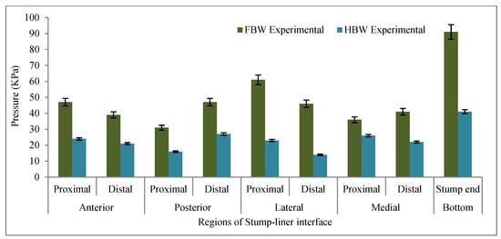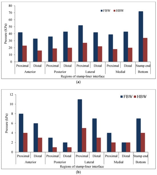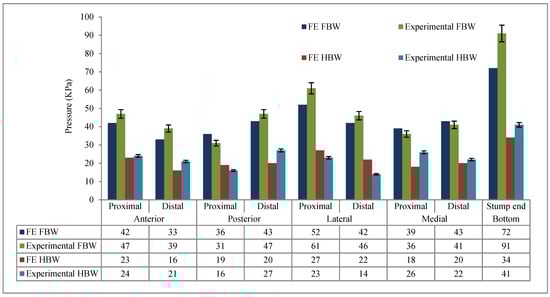 The maximum pressure was observed at the stump end, with values of 91 ± 4.55 kPa under FBW and 41 ± 1.23 kPa under HBW conditions. For FBW, the interface pressure ranged from 31 ± 1.55 kPa to 91 ± 4.55 kPa, while for HBW, it ranged from 14 ± 0.42 kPa to 41 ± 1.23 kPa.