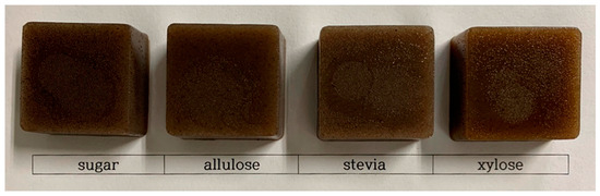 Alternative sweeteners confer sweetness to food products while mitigating concerns related to their calorie content and glycemic effects [12,13]. Xylose, a naturally occurring sugar alcohol found in small quantities in various fruits and vegetables, matches the sweetness of sucrose, but has approximately 40% fewer calories [14]. In addition, xylose has a lower glycemic index (GI of 7) than sugar (60–70). Allulose, also known as d-psicose, is a rare sugar that is present in small quantities in certain fruits. Allulose is approximately 70% as sweet as sucrose, but provides only 0.2–0.4 kcal/g [15]. As allulose is not metabolized by the body, its caloric value is extremely low—approximately 0.39 kcal/g. Stevia, a natural sweetener derived from the leaves of Stevia rebaudiana, is 200–300 times sweeter than sugar [16]. However, the incorporation of alternative sweeteners can sometimes result in unfavorable physicochemical properties (e.g., a shortened shelf life) or sensory attributes (e.g., an unpleasant aftertaste) in food products [17,18]. Therefore, further research is required to optimize formulations containing alternative sweeteners to enhance the stability and sensory appeal of food products.