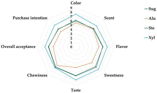 Radar chart of consumer preferences for Yanggaeng made with Corni fructus powder and alternative sweeteners. Sug, control; Yanggaeng treated with 2% C. fructus powder (CF) and sugar; Alu, Yanggaeng treated with 2% CF and allulose; Ste, Yanggaeng treated with 2% CF and stevia; Xyl, Yanggaeng treated with 2% CF and xylose. Data are expressed as means ± standard deviation (n = 3). Statistical analysis was performed using one-way ANOVA followed by Duncan’s post hoc test.