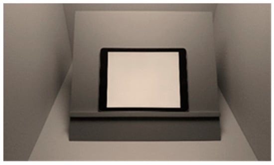 The experiment is conducted in a viewing booth, and the interior walls are painted using Munsell N7 spectrally neutral paint. The booth measures 60 cm in length, 60 cm in width, and 60 cm in height. A 9.7-inch e-reading device (6th generation iPad with a black border) is positioned on a custom table, tilted at a 45-degree angle to the horizontal plane. This table is centrally located within the booth and is also coated with Munsell N7 neutral paint. A chin rest is mounted outside the booth, aligned with the center of the opening, allowing the observers to view the screen at a perpendicular angle. Figure 1 illustrates the experimental setup from the observer’s point of view, with the viewing distance between the eye and the iPad being approximately 45 cm. After a 30 min warm-up period, the iPad’s peak luminance reaches 549 cd/m2, with a chromaticity of (x = 0.3133, y = 0.3299) in the CIE 1931 xy chromaticity diagram. An 11-channel spectrally adjustable LEDCube (Thouslite Ltd., Changzhou City, China) is used to generate uniform illumination within the viewing booth. The experimenter meticulously adjusted the 11 channels of the LED to create eight different light sources, which include four levels of illuminance (1200 lx, 600 lx, 300 lx, and 150 lx) and two CCT levels (3500 K and 6500 K). During the experiment, the space had no general lighting, with the tunable LEDCube being the sole light source. The relative spectral power distributions are displayed in Figure 2, and the characteristics of the eight light sources are listed in Table 1. These measurements are taken using a reflectance standard, a calibrated illuminance meter (CL200A, Konica Minolta, Inc., Tokyo, Japan), and a calibrated spectroradiometer (Specbos 1211TM, JETI Technische Instrumente GmbH, Jena, Germany).