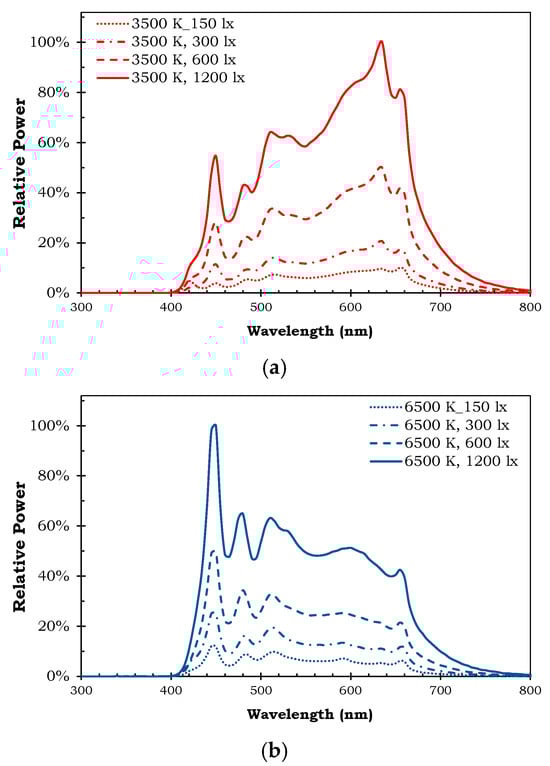 The relative spectral power distribution of the light source: (a) 3500 K (b) 6500 K.