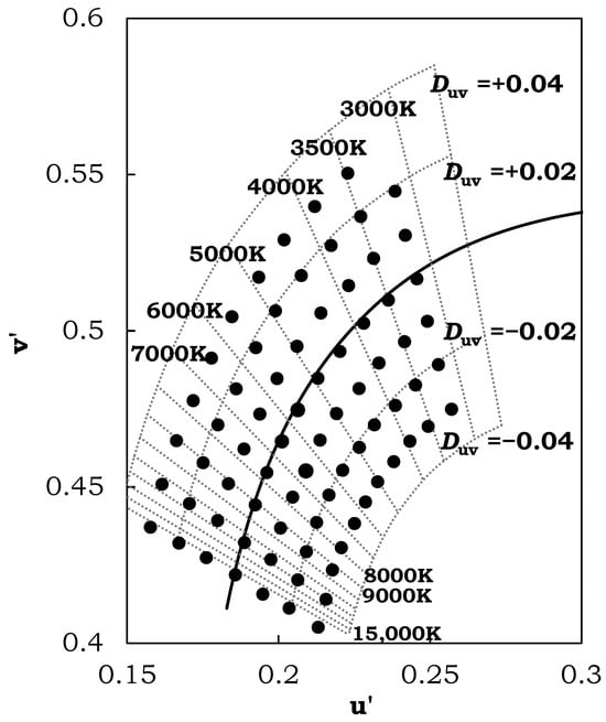 The iPad’s RGB values are modified to create 76 stimuli, with their chromaticities evenly uniform in the CIE1976 UCS. These stimuli were also adjusted to achieve a horizontal luminance level of approximately 265 ± 10 cd/m2, measured using a JETI Specbos 1211TM placed at the observer’s eye level. Each observer rated the 76 stimuli on the iPad under two different illuminance levels with a single correlated color temperature (CCT). The chromaticity details for the 76 stimuli are shown in Figure 3 and Table 2.