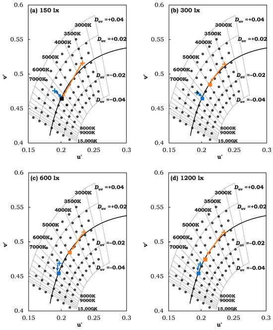 The u’ and v’ of the whitest stimulus judged by the observers under 150 lx and 1200 lx at two CCTS (labeled with a cross-blue for the light source of 6500 K and orange for the light source of 3500 K).