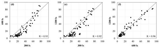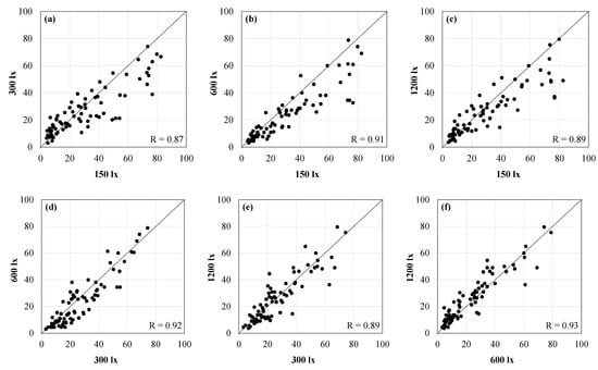 Correlation (r) between various combinations of ambient illuminance levels under 6500 K. (a) 150 lx vs. 300 lx; (b) 150 lx vs. 600 lx; (c) 150 lx vs. 1200 lx; (d) 300 lx vs. 600 lx; (e) 300 lx vs. 1200 lx; (f) 600 lx vs. 1200 lx.