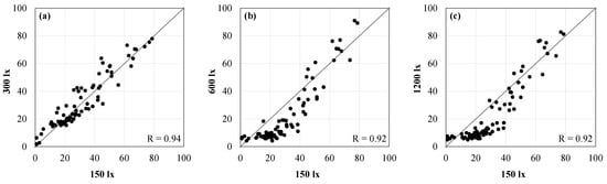 Correlation (r) between various combinations of ambient illuminance levels under 3500 K. (a) 150 lx vs. 300 lx; (b) 150 lx vs. 600 lx; (c) 150 lx vs. 1200 lx; (d) 300 lx vs. 600 lx; (e) 300 lx vs. 1200 lx; (f) 600 lx vs. 1200 lx.