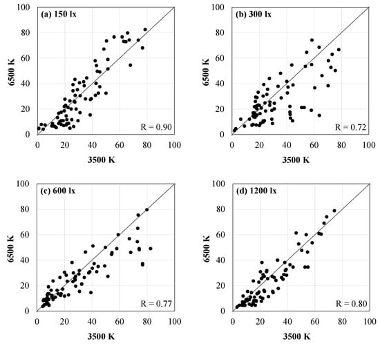 Correlation (r) between the 3500 K and 6500 K light source at each illuminance level (150 lx, 300 lx, 600 lx, and 1200 lx).