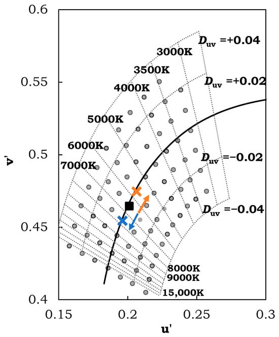 Based on the above results, this phenomenon is further organized in Figure 8, where the black square represents the chromaticity coordinates of the whitest stimulus rated by the observers under 150 lx, the orange cross represents the chromaticity coordinates of the whitest stimulus rated by the observers under 1200 lx at 3500 K, and the blue cross represents the chromaticity coordinates of the whitest stimulus rated by the observers under 1200 lx at 6500 K. According to Figure 8, as the illumination increases, the whitest stimulus for the 3500 K light source moves closer to its original light source, whereas the whitest stimulus for the 6500 K light source shifts towards a higher correlated color temperature.