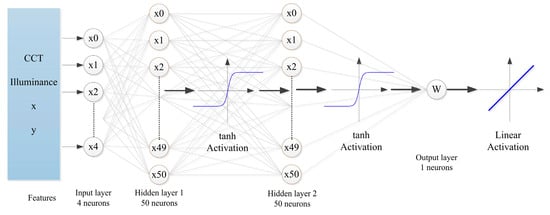 In applications, a predictive model can be developed to evaluate changes in perceived whiteness, serving as a reference for adjustments to provide optimal ambient lighting and display white point settings when using a display. This study employs an artificial neural network (ANN) to propose a perceived whiteness prediction model. Determining the input parameters is the initial step in training the machine learning model. This experiment used variables including CCT, illuminance levels, and the CIE 1931 (x, y) chromaticity coordinates of display stimuli as inputs to the model. The output was the whiteness response values from psychophysical experiments, ranging from 0 to 100. During the data preprocessing stage, the illuminance levels were first log-transformed. Subsequently, all inputs are standardized using z-score normalization, transforming the data with a mean of 0 and a standard deviation of 1. This ensures a standard normal distribution, speeding up convergence during model training. The dataset consisted of 608 records, split into training and test sets using the holdout method at an 80–20% ratio, resulting in 486 training and 122 test samples. Furthermore, 10% of the training set is used as a validation set during model training.