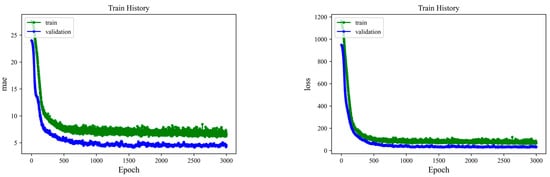The model architecture, as shown in Figure 9, included an input layer with four neurons, two hidden layers with fifty neurons each, and an output layer with a single neuron. Batch normalization was applied before the tanh activation function in each layer to make the training process faster and more stable. The loss function used is a mean square error (MSE). Additionally, a 25% dropout is added at the end of each layer to prevent overfitting. For hyperparameter settings, the Adam optimizer was employed with a learning rate of 0.001. The model was trained over 3000 epochs with a batch size of 128. Figure 10 shows the training history of the mean absolute error (MAE) and loss of the ANN model for each epoch, respectively.