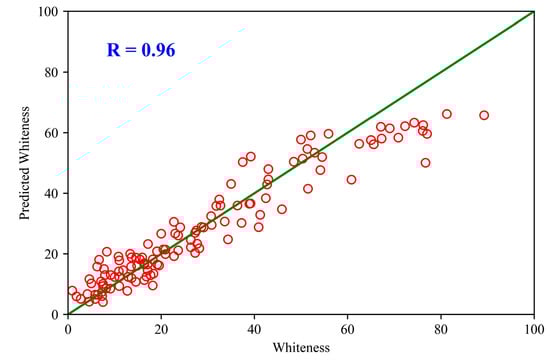 For regression analysis, the coefficient of determination (R-squared) and root mean square error (RMSE) are primarily used to evaluate the machine learning models. The average test results for RMSE, MAE, R-squared, and Pearson’s correlation coefficient are 7.128, 5.162, 0.892, and 0.956, respectively. Based on the evaluation metrics, the results demonstrate that the model can accurately predict subjective perceived whiteness, as indicated by the high R-squared value and acceptable RMSE. Figure 11 shows a scatter plot of the predicted values and the ground truth, where the distribution of the data points is closely aligned with the 45-degree line, representing a perfect prediction.