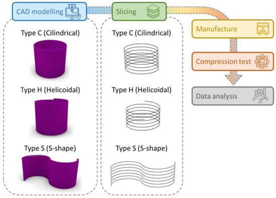 At this form, this paper explores the possibility of designing AM monolayer specimens for compression testing for Fused Layer Modeling (FFF) of polylactic acid (PLA). FFF is one of the oldest AM processes and is still very popular both for industrial and hobbyist use. FFF in its basic form produces specimens with a relatively high layer thickness; those of about 0.2–1 mm are common [2,3,4,14,19]. The high layer thickness facilitates the qualitative and quantitative analysis of the specimen macro-geometrical quality after manufacturing as well as the post-test inspection of the failure mode. In this paper, the compression behavior of single-layer structures is analyzed and confronted with multilayer data obtained from the literature.