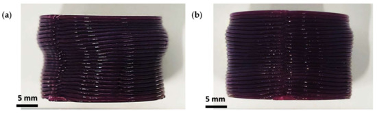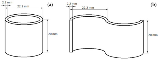 The minimum necessary diameter of the circular specimen was determined by buckling criteria using the actual wall thickness obtained for the manufacturing experiments. Out of the buckling cases established by Euler, the one with the smallest allowable maximum force Rc before buckling onset (for two ends that are free to rotate) was used to calculate the resulting minimum diameter of the specimen. Solving the resulting inequality numerically, a minimum diameter of 5.6 mm would be needed in order to avoid buckling of the specimen before the expected compression strength of about 100 MPa [7,20] is reached. In order to account for other effects between the extruded filaments of the specimen, an about four times higher diameter of d = 22.2 mm is chosen to make sure that no inadvertent buckling will occur. When disregarding the material thickness, the diameter of the circle that the print head follows is d = 20 mm. This has the added advantage of being equal to the specimen height. The dimensions of the specimens can be seen in Figure 3.