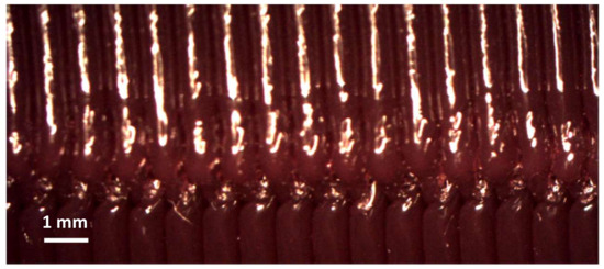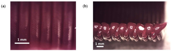 The S-shaped routes that were deposited in a back-and-forth manner caused some other interesting macro- and micro-geometrical effects. For one, the layer transition point was always located at the edge of the specimen, increasing the structural difference between this point and the rest of the geometry. Also, the microstructure of the extruded filament surface alternated in directionality every other layer, as can be seen in Figure 7. Small diagonal ridges were formed by the print head on the extruded material along the direction of extrusion. The alternated deposition directions caused these ridges to alternate.