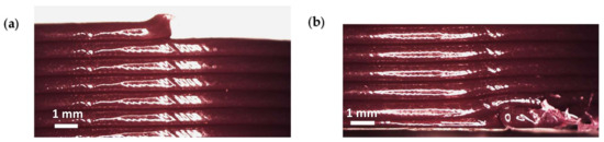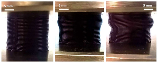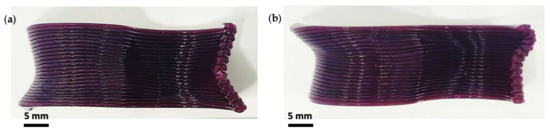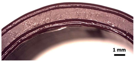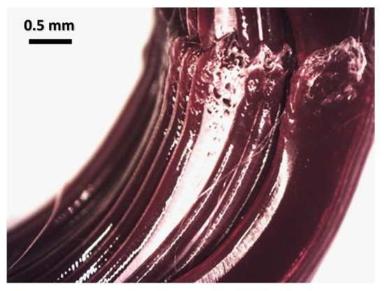 As the first loop of the geometry was extruded with less layer thickness and material flow, the second filament normally encompassed the first, as shown in Figure 6.