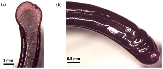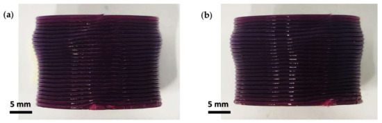 Towards the end of the extrusion process for each layer, the print sometimes became inhomogeneous, as is visible in the last layer of a specimen in Figure 8. The end point of the extrusion slightly protruded from the geometry in z-direction. However, the difference in height was negligible compared to the helicoidal monolayers.