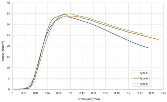 The compression strength values were very similar for all three types of specimens, with the helicoidal trajectory type performing slightly better. This suggests that the defects associated with the manufacture of each specimen do not significantly influence the compression behavior of the specimens. As the specimen Type H was both a closed geometry as well as fairly uniform due to the missing fixed layer transition point (as it was present compared to circular trajectories), this was expected. This can be seen both in the mean values and in the behavior of the stress–strain curve. In all three cases, a very similar elastic zone can be observed, with very similar behavior. The specimens with closed geometry have a similar maximum stress, with Type S being lower because it is open. In the plastic deformation zone, Type S has the steepest drop, suggesting a lower ductility or capacity to maintain strength after the elastic limit, which may be caused by its open geometry. Thus, it appears that the helical path is the one that best withstands the compressive conditions although with little difference with respect to Type C, while the open geometry offers a worse result, with a more premature collapse.