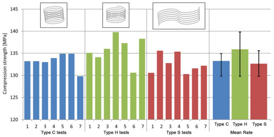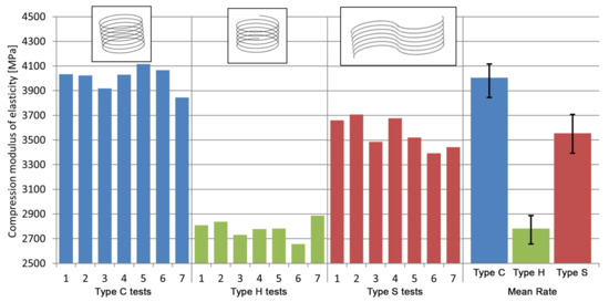 The compression properties of the three types of specimen were determined experimentally. The mean resulting compression strength and modulus of elasticity values can be found in Table 1. The data obtained are compared with the literature values obtained on standardized non-monolayer specimens. Figure 9 shows the comparison of the mechanical compression behavior of the three geometry types. All data obtained for each sample have been represented, the compression strength in Figure 10, and the compression modulus of elasticity in Figure 11.