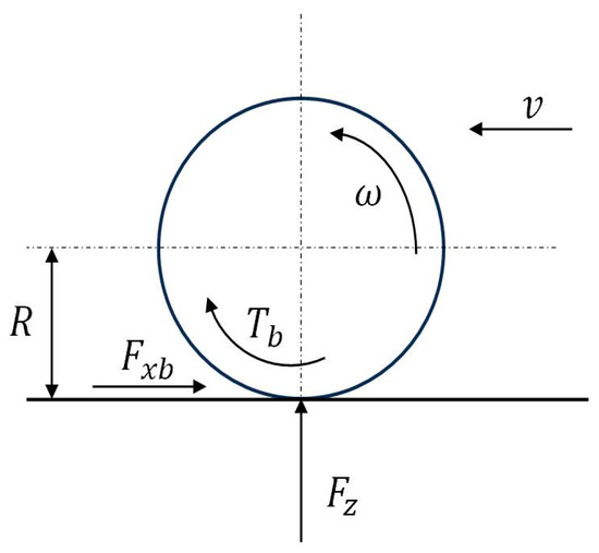To simplify the analysis, the effects of rolling resistance and grade resistance are neglected, and a single-wheel model is used as the basis for studying the problem. Figure 1 shows a schematic diagram of the braking forces; its dynamics equations are as follows [22]:
