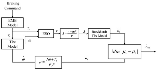 - The force acting on a single wheel and the road–tire model were analyzed. For the EMB system, a road recognition algorithm based on an extended state observer (ESO) was designed. During emergency braking conditions, this algorithm observes the current longitudinal vehicle speed to obtain the current slip ratio. By calculating the utilization adhesion coefficient for typical road surfaces and comparing it with the actual road surface adhesion coefficient, the algorithm identifies the road type. This approach meets the requirements for road recognition accuracy and response time during emergency braking scenarios;