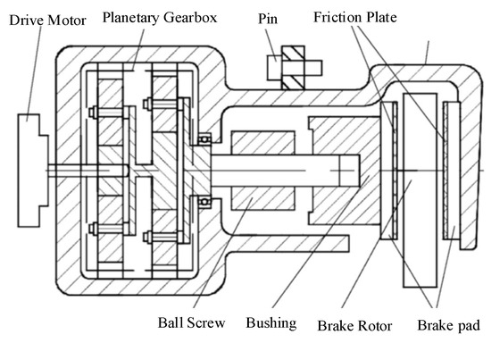 In this paper, the floating caliper disk structure type model from Ref. [29] is used, including the following components, as shown in Figure 3: a drive motor, a planetary gear mechanism, a ball screw mechanism, and a brake disk. The braking torque equations are shown in (2) to (3).