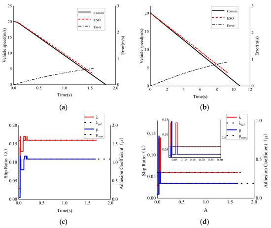 Simulation results of pavement identification. (a) Speed observation on dry cement road. (b) Speed observation on snowy road. (c) Dry cement road recognition. (d) Snow road recognition.