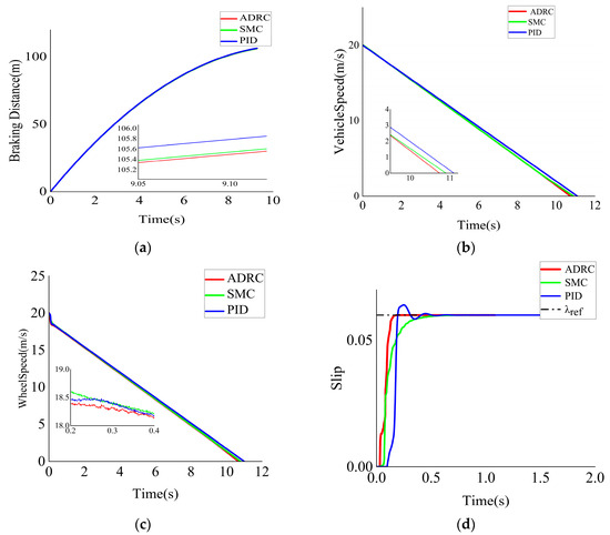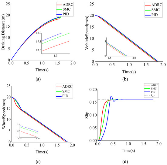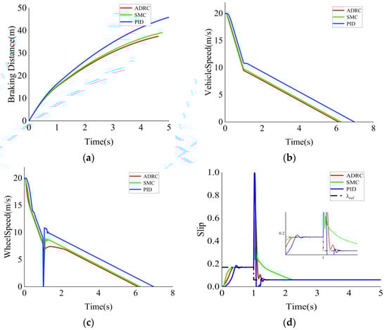 Figure 7 shows the braking effect of the three ABS control strategies, ADRC, SMC, and PID, on dry concrete road. From Figure 7a, it can be seen that the braking distance under the ADRC strategy is less than under the SMC and PID control strategies. Figure 7b,c shows that the ADRC strategy can produce a smooth and fast decrease in speed, which is better than the SMC and PID control. In terms of slip rate control, as shown in Figure 7d, neither ADRC nor SMC showed overshooting, and PID showed overshooting; the response time of ADRC to reach the steady state value was faster than that of SMC and PID, and there was no wheel holding phenomenon. The results show that the ABS under the control of the ADRC algorithm has better braking performance and improves the braking effect on dry cement road.