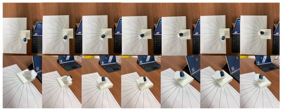 To evaluate the reliability of the angle sensors, we created devices that replicate the movements of the right thumb. For radial abduction, a cylinder was tilted from a horizontal position to 0°, 15°, 30°, and 45°. For pronation, horizontal planes were created on the side of the cylinder at −30°, 0°, 30°, and 60° tilts from the top surface. A total of 16 such devices were fabricated using a 3D printer (Stereo Lithography Apparatus, DMM.make). The accuracy of the angles of these devices was measured within ±0.5° using a square ruler. To reproduce palmar abduction, a protractor was used to mark the angles at 0°, 15°, 30°, 45°, 60°, 75°, and 90°. The angle sensor was affixed to the horizontal plane of the device using tape, and the device was moved along the lines corresponding to each marked angle. At each angle, 112 values displayed by the application were recorded over 2 s. This procedure was repeated 10 times for each mark, and the mean absolute error (MAE) was calculated (Figure 2).