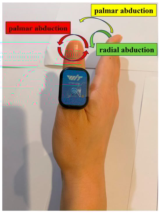 In this study, we used an angle sensor to obtain references for the true angle and verify the accuracy of angle estimation. The angle sensor used was a WitMotion WT9011DCL Bluetooth 5.0 Accelerometer Gyroscope Angle Sensor with an electronic compass, a magnetometer, and an inclinometer (accuracy: X- and Y-axes—0.2°, Z-axis—1°; output rate: 0.2 Hz–200 Hz; maximum distance: 90 m; dimensions: 23.5 mm × 32.5 mm × 11.6 mm; weight: 9 g; manufacturer: WitMotion). This model was selected due to its high accuracy, compact size, and affordability. These characteristics made it suitable for capturing precise thumb motion while maintaining its ease of use and cost-effectiveness. The angle sensors were calibrated prior to measurement according to the manufacturer’s instructions. Following calibration, the accuracy of the sensors was reported to be 97% or higher for all measurements. The angle data were sampled at 100 Hz, and the signals were synchronized. The data were immediately transferred to a laptop (Surface Pro 8, Microsoft Corporation, Redmond, WA, USA) via a Bluetooth personal area network.