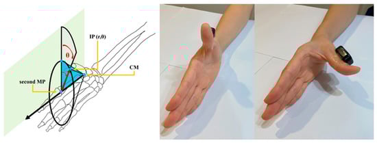 The angle sensor was fixed to the dorsal midpoint of the metacarpal bone of the right thumb along its bone axis using tape. The sensor measured radial abduction, palmar abduction, and pronation angles.