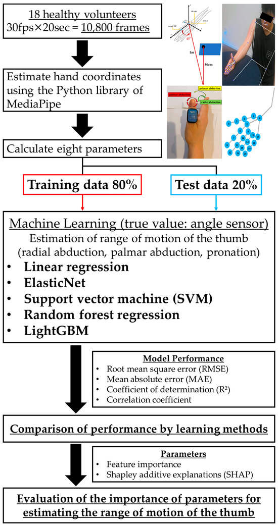A total of 10,800 images of right-thumb abduction movements were obtained from the 18 subjects, along with data on radial abduction, palmar abduction, and pronation angles collected by an angular sensor that was synchronized with the images. MediaPipe was used to detect joint coordinates based on the images, and eight parameters were created. The obtained images were randomly split into 80% training data for hyperparameter optimization during ML model development and 20% test data for evaluating the performance of each model. Hyperparameter tuning was performed for each ML algorithm using the training data, and the performance of the models was evaluated using metrics such as root mean square error (RMSE), mean absolute error (MAE), coefficient of determination (R2), and correlation coefficient.