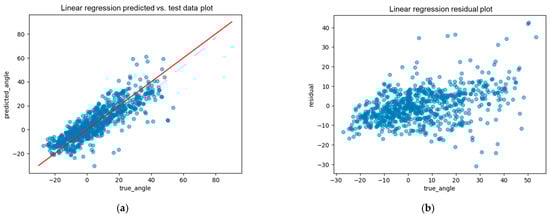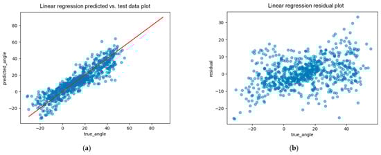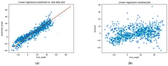 (a) The actual angles obtained from the test data for radial abduction compared with their predicted angles obtained from the training data using the linear regression model. (b) The residuals (actual angles − predicted angles) of the linear regression model for radial abduction plotted and compared against the actual angles in the test data.