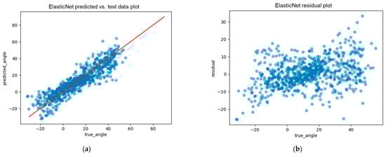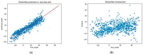 (a) The actual angles from the test data for radial abduction compared with their predicted angles obtained from the training data using the ElasticNet model. (b) The residuals (actual angles − predicted angles) of the ElasticNet model for radial abduction plotted and compared against the actual angles in the test data.