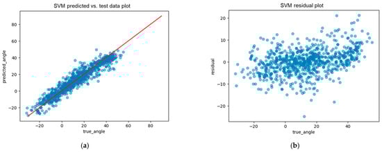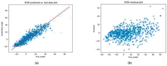 (a) The actual angles from the test data for radial abduction compared with their predicted angles obtained from the training data using the SVM model. (b) The residuals (actual angles − predicted angles) of the SVM model for radial abduction plotted and compared against the actual angles in the test data.