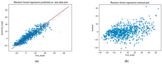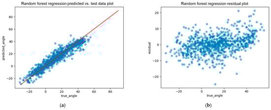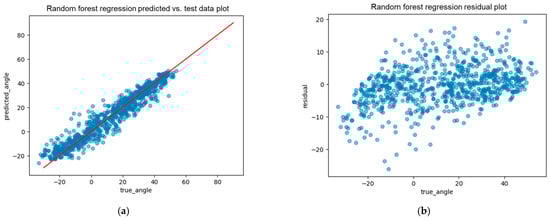 (a) The actual angles from the test data for radial abduction compared with their predicted angles obtained from the training data using the random forest regression model. (b) The residuals (actual angles − predicted angles) of the random forest regression model for radial abduction plotted and compared against the actual angles in the test data.