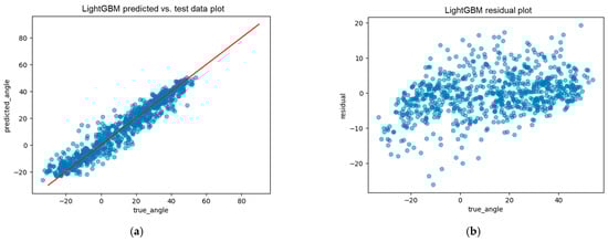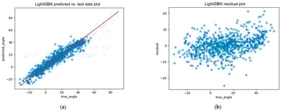 (a) The actual angles from the test data for radial abduction compared with their predicted angles obtained from the training data using the LightGBM model. (b) The residuals (actual angles − predicted angles) of the LightGBM model for radial abduction plotted and compared against the actual angles in the test data.