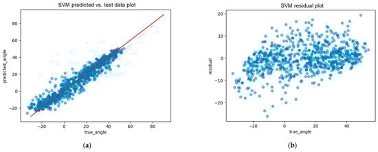 (a) The actual angles from the test data for pronation compared with their predicted angles obtained from the training data using the SVM model. (b) The residuals (actual angles − predicted angles) of the SVM model for pronation plotted and compared against the actual angles in the test data.
