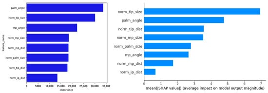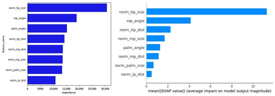 Machine learning was performed using training data randomly extracted from a total of 10,800 images. Among the evaluated ML models, LightGBM demonstrated the highest accuracy for radial abduction, palmar abduction, and pronation. The results are summarized in Table 4, Table 5 and Table 6. The hyperparameters used for training each model are listed in Table 7. For radial abduction, palmar abduction, and pronation, two types of plots were created for each ML model: one plotting the actual values (true angles) on the x-axis and the predicted angles on the y-axis and another plotting the actual values (true angles) on the x-axis and the residuals (actual angles − predicted angles) on the y-axis (Figure 8, Figure 9, Figure 10, Figure 11, Figure 12, Figure 13, Figure 14, Figure 15, Figure 16, Figure 17, Figure 18, Figure 19, Figure 20, Figure 21 and Figure 22). The feature importance and SHAP (Shapley additive explanation) values, along with their interrelationships, are presented for the LightGBM model when estimating radial abduction, palmar abduction, and pronation (Figure 23, Figure 24 and Figure 25). When the feature importance was evaluated for each angle estimation, it was found that the score for norm_tip_size was notably high for radial and palmar abduction, suggesting that it had a significant impact on the models when estimating these angles. Conversely, the score for palm_angle was high for pronation, indicating that this feature plays a major role in estimating the pronation angle. An evaluation of the SHAP values revealed that norm_tip_size had high positive scores for palmar abduction and pronation. For radial abduction, however, norm_tip_size demonstrated high scores in both the positive and negative directions.