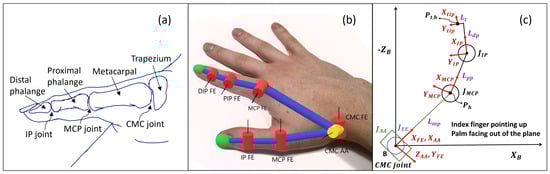Human thumb (a) Anatomy, (b) Visual of assumed kinematic model, and (c) Kinematic model schematic.