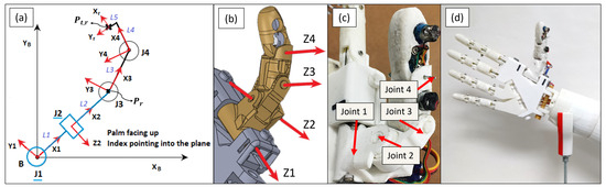 The robot thumb is a four−link serial manipulator with four rotational joints (see Figure 2d) and its solid model and joint motion axes are shown in Figure 2c. The 3D−printed robot thumb is outfitted with an individually controlled servo motor for each joint, as shown in Figure 2b. The kinematics of the robot thumb following the mDH notation are presented in Table 2 with the values obtained from the 3D solid model. , , , and are the link lengths, and is the offset distance to the contact surface point of the robot thumb.