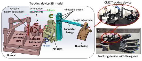 The bracelet, pot joint, connector linkage, and the metacarpal (along with the CMC joint FE axis) establish a four−bar linkage mechanism, as presented in Figure 4. Thus, the CMC joint FE and AA motions are transferred to the pot joint and measured by their respective axis potentiometer. The FE and AA axis rotational potentiometers are attached on the pot joint (model PT6MV−103A2020, 0 to rotation, 0–10 K resistance, and 6.3 mm diameter []).