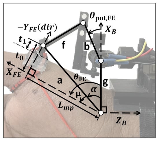 where , is the angular displacement of the FE pot joint relative to (the X axis of the kinematic base frame in Figure 4), and . The link lengths f and b are obtained from the 3D model of the tracking device. The FE axis pot joint angular displacement, , is estimated using Equation (3):
