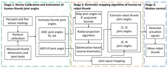 The telemanipulation of the robot thumb using the developed CMC tracking device and the flex glove is accomplished through a three−stage framework, as shown in Figure 5. The three stages are device calibration and estimation of human thumb joint angles, kinematic analysis to map human thumb to robot thumb joint motion, and robot thumb motion control.