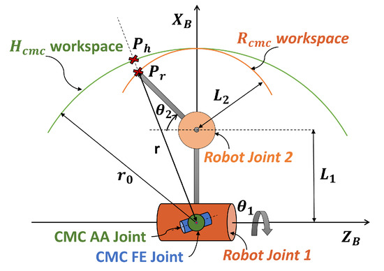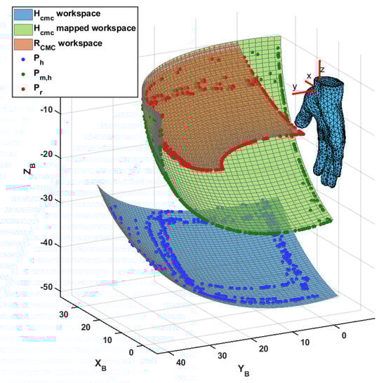 The workspace is the partial surface of a sphere with radius , whereas that of is the partial surface of a warped ellipsoid as shown in Figure 7a. Due to the geometric differences between these two workspaces, the distal end of () cannot reach the actual position of the distal end of the metacarpal phalange ().