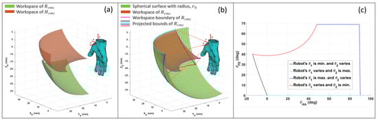 The proposed RPA maps the motion of to such that follows radially towards the base, as shown in Figure 6. Note that cannot follow throughout its workspace due to the joint range limitations. The workspaces of and are shown in Figure 7a. The workspace radius, , is user−specific and is the length of the user’s first metacarpal, . The mapped area using radial projection from the to the workspace does not change even if the workspace radius changes; however, it depends on the boundary of the workspace which is a function of the user−specific joint limits and offsets.