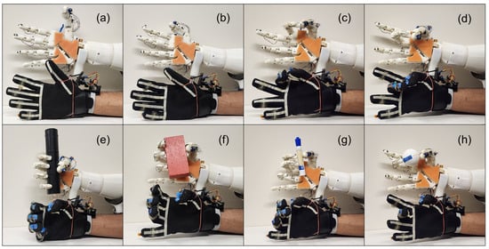 Telemanipulation of the ARH by Volunteer 1. (a,b) CMC joint pure flexion and extension poses. (c,d) Thumb opposition with index and middle fingers. (e–h) Grasps for different objects (cylinder, cuboid, marker, and sphere) using the developed system.
