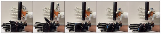 Time−lapse images of Volunteer 1 thumb poses followed by the thumb of the ARH to grasp a cylinder.